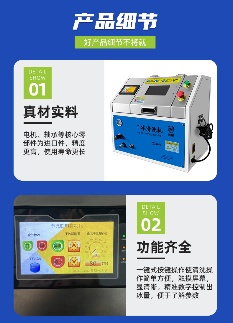 干冰清洗降低了清洗的人工成本、生产设备的停机时间和废物处理成本,从而减少了清洗的诸多负面影响;并且不需要干燥和冷却时间,降低了很多不必要的成本。