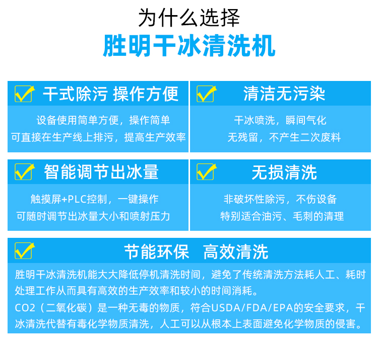 干冰清洗降低了清洗的人工成本、生产设备的停机时间和废物处理成本,从而减少了清洗的诸多负面影响;并且不需要干燥和冷却时间,降低了很多不必要的成本。
