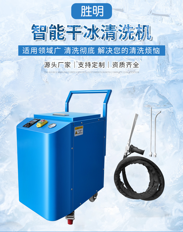 二氧化碳在-78.5°时凝固成固体,即干冰,干冰粉碎后分散在高压空气中,然后通过高速喷嘴加速后冲击到被清洁的表面。高压气浪,再加上其中的干冰颗粒吹扫模具表面的残留物。高聚物在低温时变脆,并且变冷收缩,和模具分离。干冰颗粒在撞击时升华,由固体变成气体,膨胀了数百倍,进一步产生了冲击力,从而达到快速、高效的清洗效果。