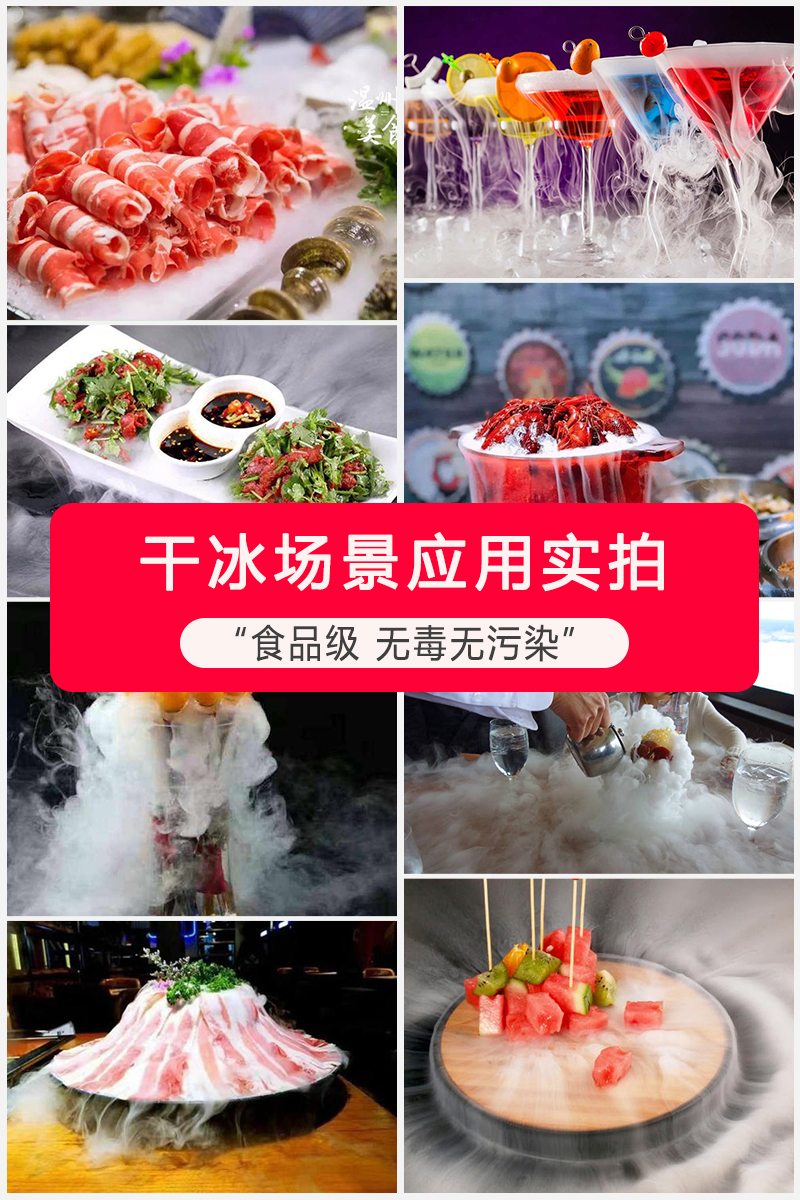 3、星级宾馆、酒楼制作的海鲜特色菜肴,在上桌时加入干冰,可 以产生白色烟雾景观,提高宴会档次,如制作龙虾刺身。
