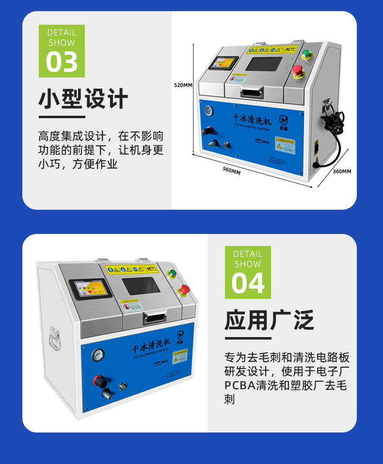 干冰清洗降低了清洗的人工成本、生产设备的停机时间和废物处理成本,从而减少了清洗的诸多负面影响;并且不需要干燥和冷却时间,降低了很多不必要的成本。
