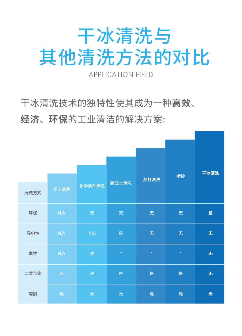 干冰清洗降低了清洗的人工成本、生产设备的停机时间和废物处理成本,从而减少了清洗的诸多负面影响;并且不需要干燥和冷却时间,降低了很多不必要的成本。